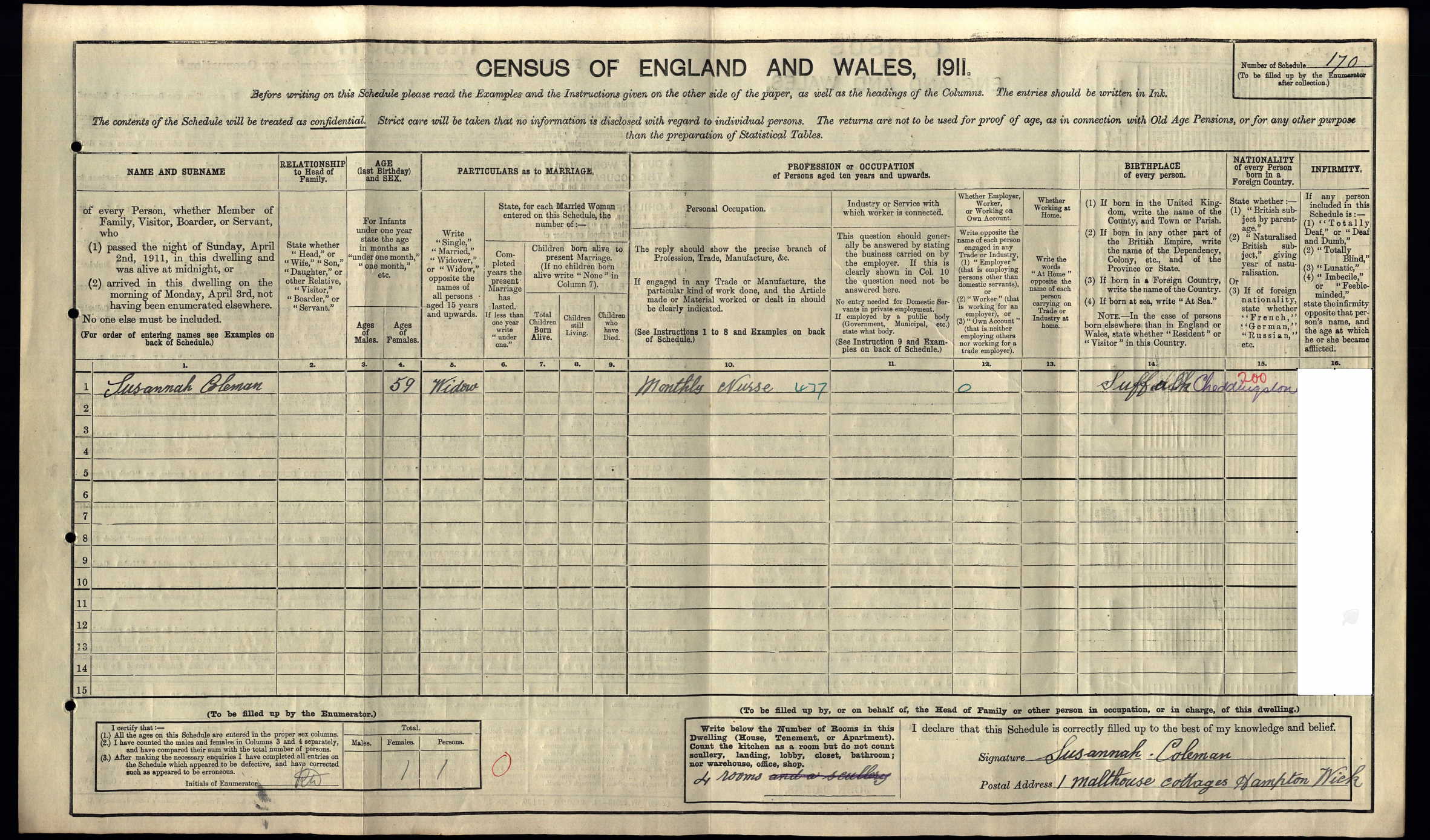 1911 Census Schedule # 170
