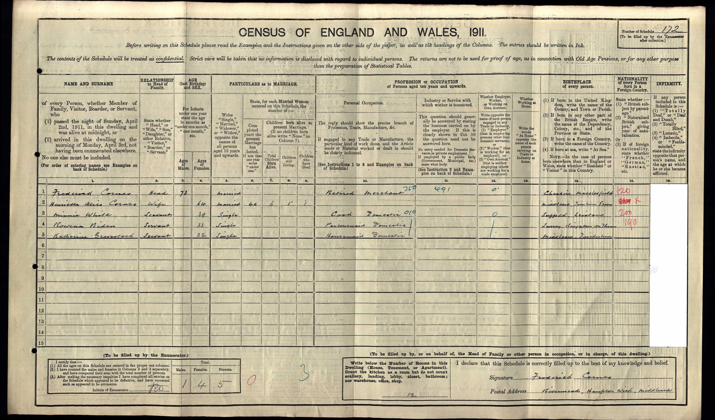 1911 Census Schedule # 172